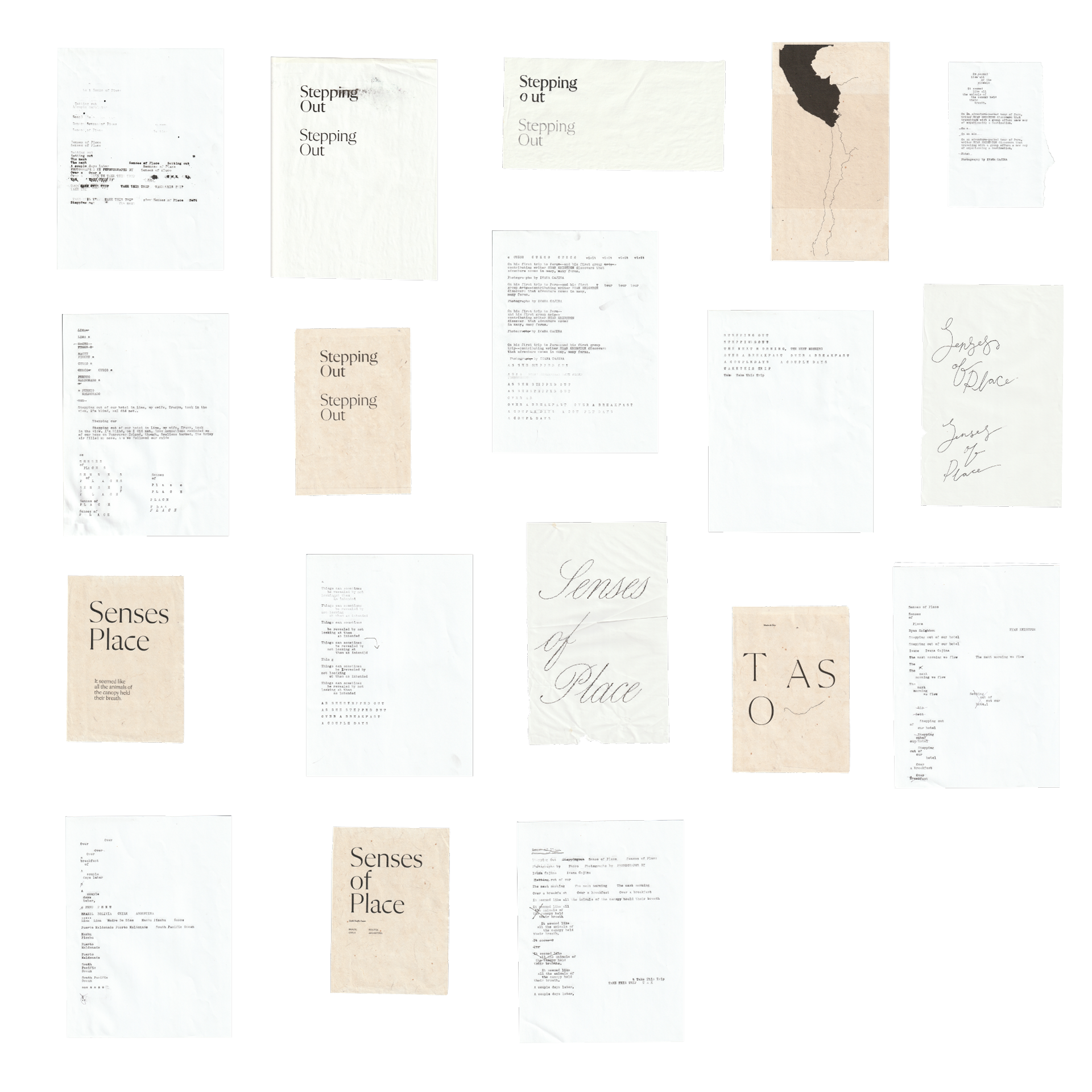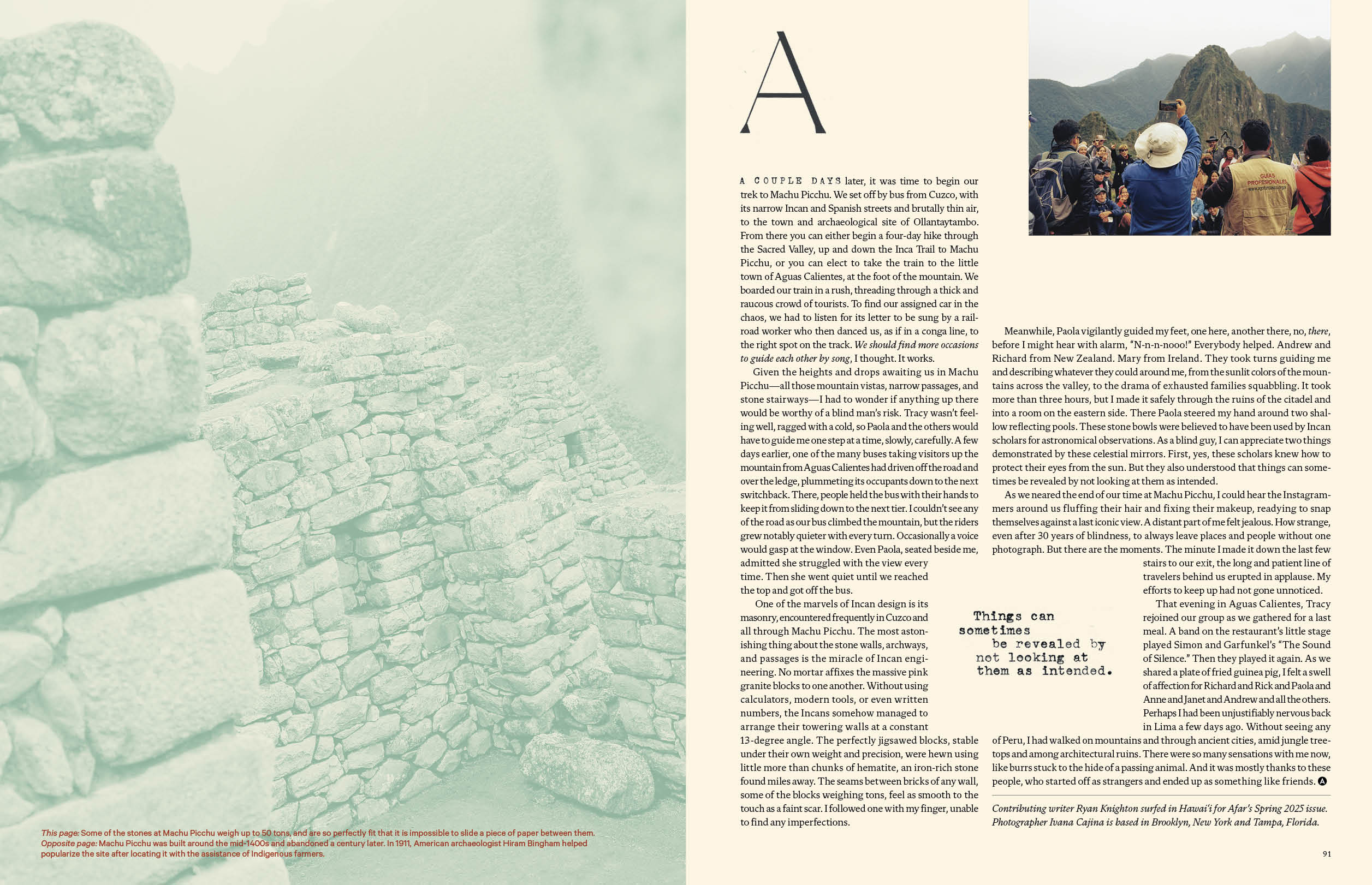 The focus on this story was the tactility and surrounding atmosphere of Peru. With photography, we leaned into the details that Knighton mentions, zooming into those moments and scaling back photography of vistas, obsucring some of them behind duotones so the reader has to work a little harder. With the type, the display copy when through a physical process. Larger display was printed out and scanned back in, retaining its elegance but gaining a little more personal touch. Smaller display was typed out on a typewriter.